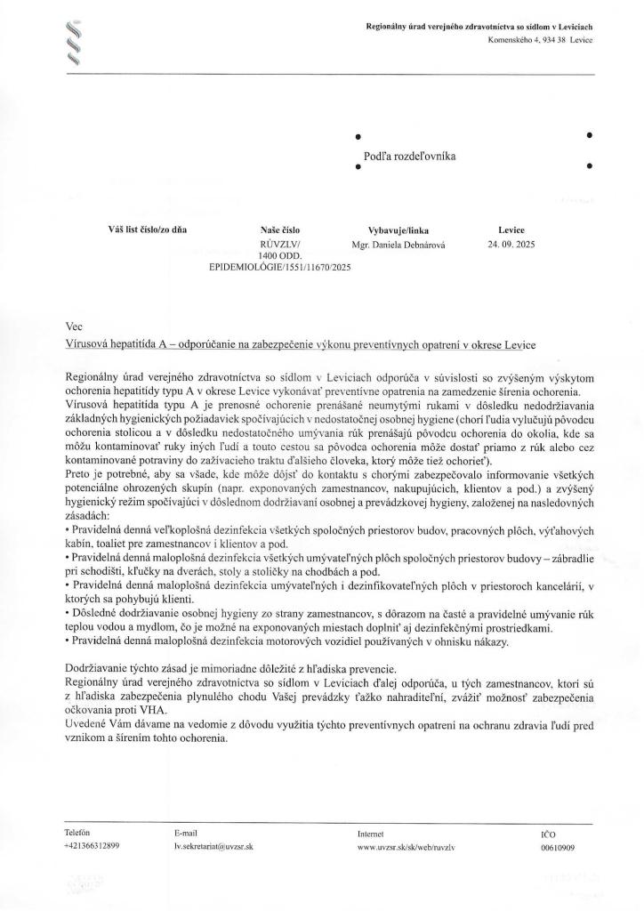 Regionálny úrad verejného zdravtoníctva so sídlom v Leviciach zasiela odporúčanie na zabezpečenie výkonu preventívnych opatrení v okrese Levice na zamedzenie šírenia ochorenia Vírusová hepatitída A.