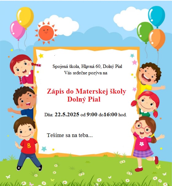 Dňa 22.05.2025 v čase od 9:00 hod. do 16:00 hod. sa uskutoční zápis detí do Materskej školy